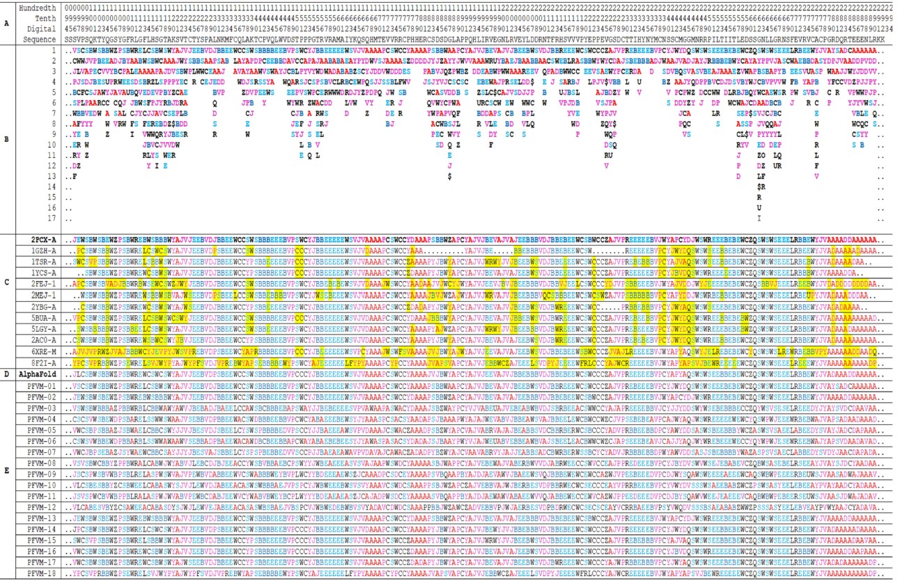 The protein sequence is listed in section A; the PFVM in section B; the conformations in PFSC string for