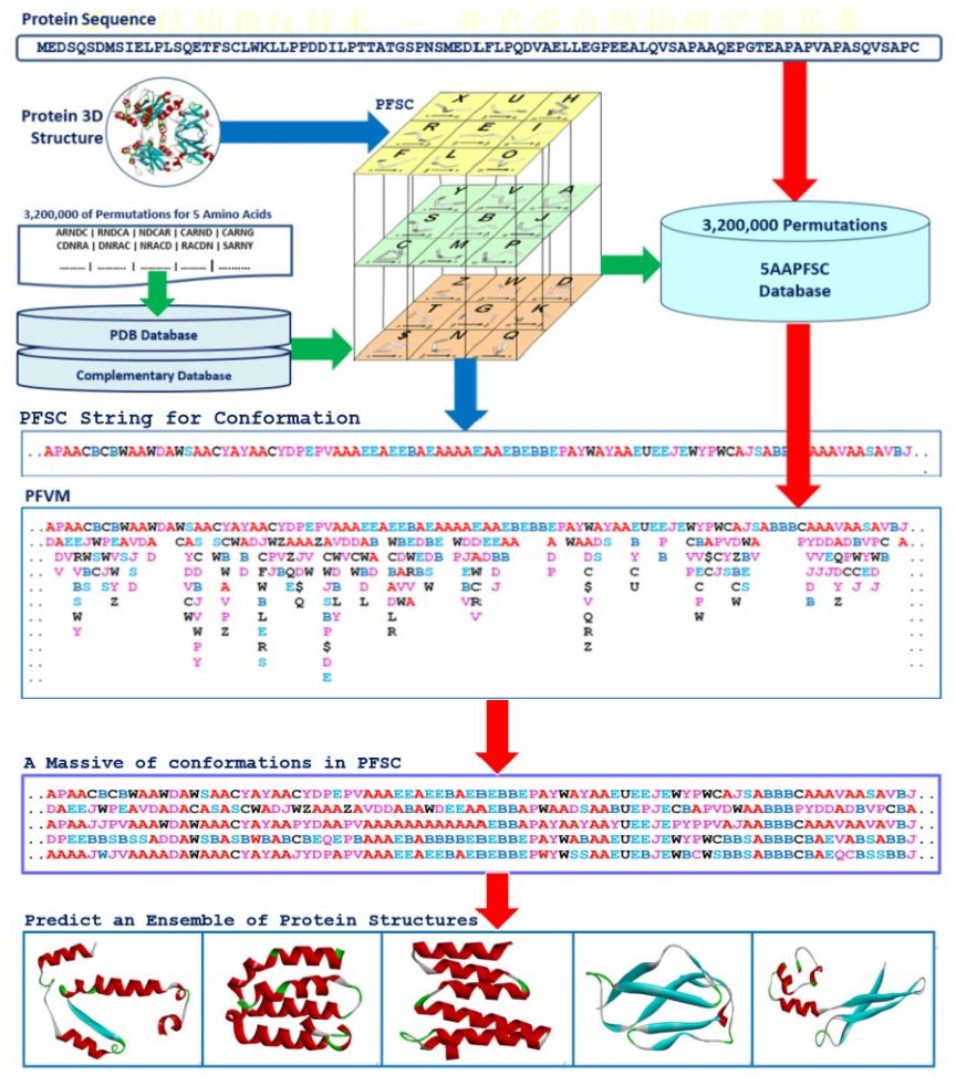 a FiveFold approach was developed with a single sequence method. It applied the protein folding shape code (PFSC) uniformly to expose local folds of five amino acid residues, formed the protein folding variation matrix (PFVM) to reveal local folding variations along sequence, obtained a massive number of folding conformations in PFSC strings, and then an ensemble of multiple conformational protein structures is constructed. The red arrows indicated the process to predict an ensemble of protein structures from a protein sequence with the PFVM.