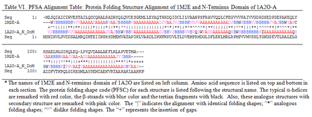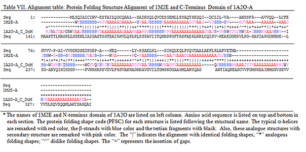 The PFSA alignment table in Table VI and Table VII correspondingly shows the alignment of 1M2E with N-terminal domain and C-terminal domain of 1A2O-A. The sequence-independent alignment mode is applied for these comparisons. The alignment tables in Table VI and Table VII display how the fragments with similar local folding shapes are matched up with insertion of gaps. In alignment table, the aligned protein folding shape code with identity is marketed with “|”, the analogue with “*”, the dislike with “^” and the insertion with “+”. Actually, the alignment table shows the optimized structural alignment with matching all local structural fragments between two proteins. The PFSA-S provides the quantitative assessment of similarity for global structural comparisons with 1M2E, which is listed in Table V, including the numbers of identity and analog of folding shapes, and the number of insertion gaps. In contrast to C-terminal domain, the comparison of N-terminal domain of 1A2O-A and 1M2E have higher PFSA-S similarity score, larger number of identical and analogous folding shapes and less number of gaps, which agrees with the difference of two pairs of structures.
