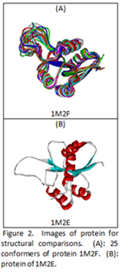 Here 25 conformers of protein 1M2F (PDB ID) in Fig. 2(A) are compared with 1M2E in Fig. 2(B) which is average structural models of 25 conformers. These structures have same sequence with higher degree of similar in conformation.
