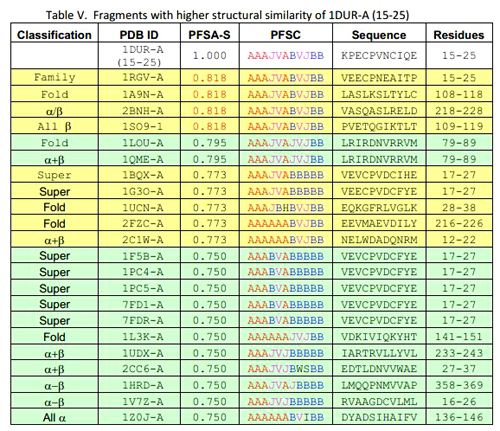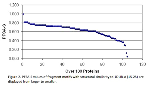 Results and similarity score: The fragments with structural similarity to1DUR-A (15-25) are ranked by PFSA-S. Part of top results is displayed in below table. All PFSA-S value is plotted in Fig. 2.