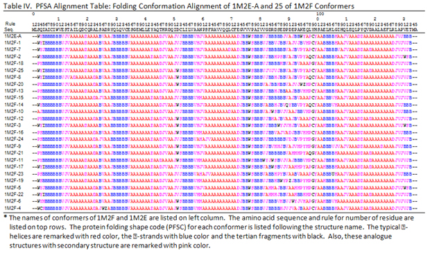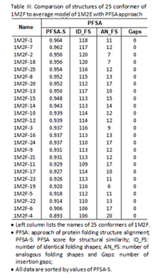 The PFSA alignment table is displayed in Table IV according the rank of PFSA-S in Table III. The alignment table demonstrates that the PFSA approach does not only align the secondary structure (font with red and blue colors), but it also exhibits the attributes of tertian structure (font with black color). The font with pink color indicates the location of perturbation inside the secondary structure or the soft shape transfer on terminus of secondary structure. Actually, the alignment table is obviously to show which local fragments of residues are structural stability or flexibility. For example, the conformation of fragment with residues (82-106) is more elastic than other local structures. Although these conformers have very close structural similarity, however, the PFSA approach has ability to differentiate each conformer with its appropriate sensitivity.